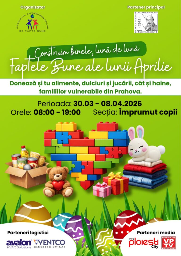 Asociația Antreprenorilor de Fapte Bune organizează, în perioada 30 martie – 8 aprilie 2026, campania „Faptele Bune ale lunii Aprilie” pentru a sprijini familiile vulnerabile din Prahova cu ocazia sărbătorilor de Paște.