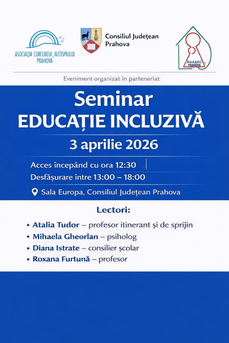 Asociația Curcubeul Autismului Prahova, în parteneriat cu DGASPC Prahova, are deosebita plăcere de a vă invita să participați la Seminarul de Educație Incluzivă, organizat în data de 3 aprilie 2026, începând cu ora 13:00, in Sala Europa a CJ Prahova.