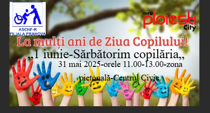Prin campania ,,1 Iunie- sărbatorim copilaria”, Asociația de Sprijin a Copiilor Handicapați Fizic România -Filiala Prahova, va organiza diferite activitati pentru copii asociatiei: desene pe asfalt, terapie prin ras, jocuri in aer liber, în data de 31 mai, între orele 11.00-13.00, pe spatiul pietonal din Centru Civic, str. Mihail Kogalniceanu (strada cu Agentia de Bilete a Teatrului Toma Caragiu Ploiesti).