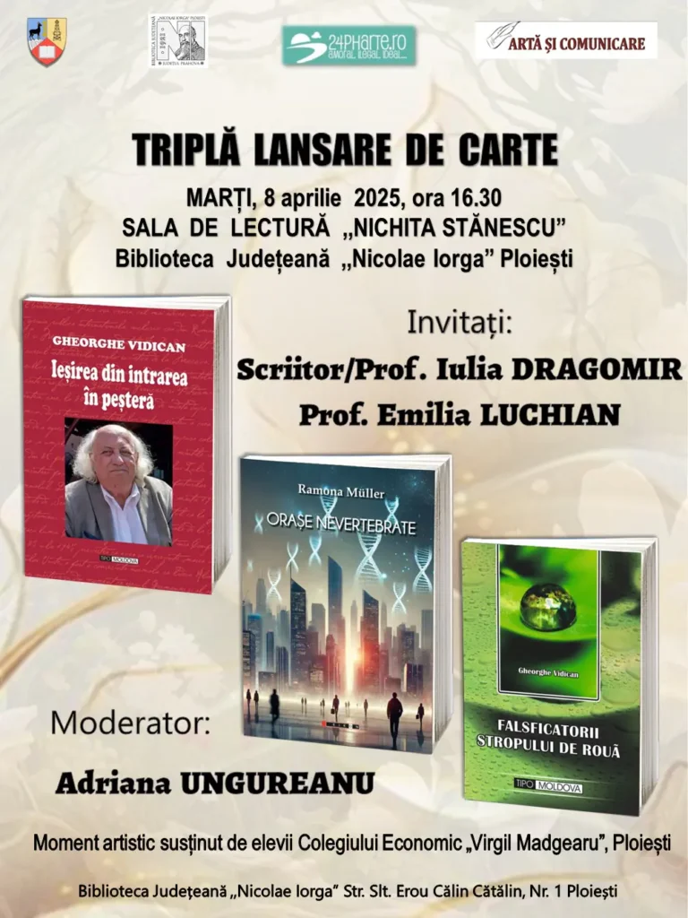 Pe 8 aprilie 2025, de la ora 16:30, în Sala de lectură „Nichita Stănescu” a Bibliotecii Județene „Nicolae Iorga” din Ploiești, are loc un eveniment literar de excepție: lansarea volumelor „Ieșirea din intrarea în peșteră” (2023) și „Falsificatorii stropului de rouă” (2024), semnate de poetul Gheorghe Vidican, alături de cel mai recent volum al scriitoarei Ramona Muller, intitulat „Orașe nevertebrate” (2025).
