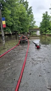 – evacuarea apei acumulate pe carosabil în zona pasarelei CF din orașul Plopeni, strada Victoriei, unde au s-a intervenit cu o autospecială de stingere și 2 motopompe.