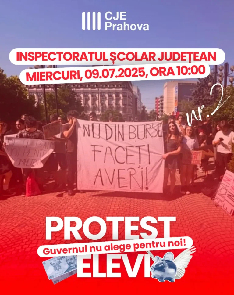 Consiliul Județean al Elevilor din Prahova organizează miercuri, 9 iulie 2025, ora 10:00, al doilea protest în fața Inspectoratului Școlar Județean