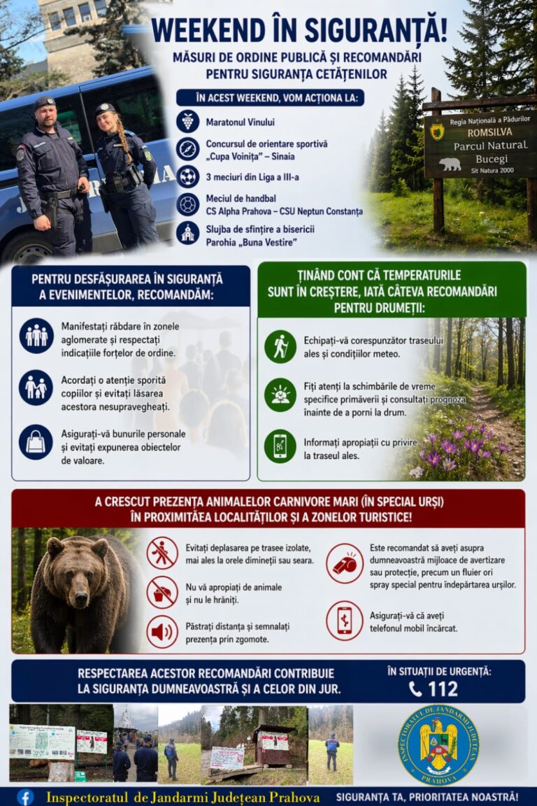 În acest sfârșit de săptămână, vom acționa pentru asigurarea măsurilor de ordine și siguranță publică la mai multe evenimente organizate la nivelul județului, precum Maratonul Vinului de la Urlați, concursul de orientare sportivă „Cupa Voinița” din Sinaia, meciurile din Liga a III-a, partida de handbal dintre CS Alpha Prahova și CSU Neptun Constanța, precum și la slujba de sfințire a bisericii Parohia „Buna Vestire”.