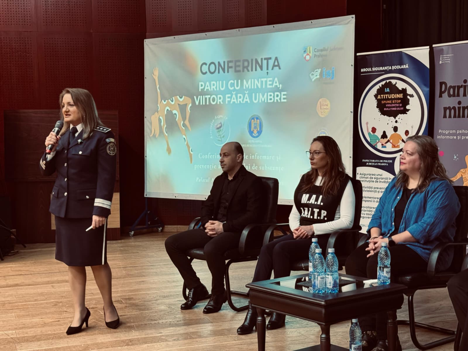 Inspectoratul de Poliție Județean Prahova a organizat astăzi evenimentul cu tema „Pariu cu mintea, viitor fără umbre”, dedicat informării și prevenirii consumului de substanțe psihoactive în rândul tinerilor, desfășurat la Consiliul Județean Prahova, în Sala „Europa”.