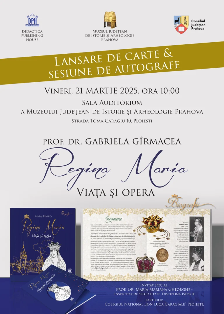 Muzeul Județean de Istorie și Arheologie Prahova, în parteneriat cu editura Didactica Publishing House şi Colegiul Național „Ion Luca Caragiale” Ploiești, are plăcerea de a invita publicul la un eveniment cultural de excepție: lansarea volumului „Regina Maria: Viaţa şi Opera”, de Gabriela Gîrmacea.