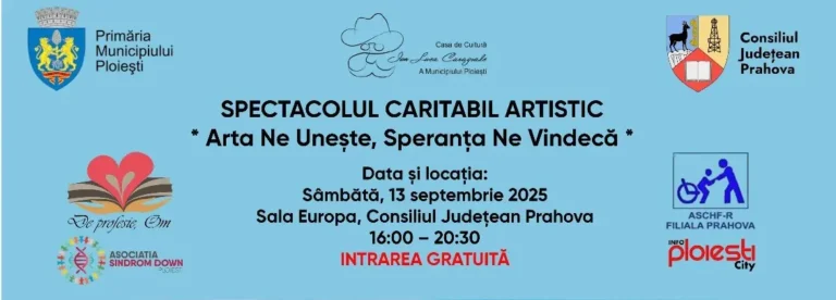 Casa de Cultură „Ion Luca Caragiale” a Municipiului Ploiești organizează, în parteneriat cu Info Ploiești City, Asociația „De profesie Om” și Asociația de Sprijin a Copiilor cu Handicap Fizic – Filiala Prahova, un spectacol cultural-artistic și caritabil.