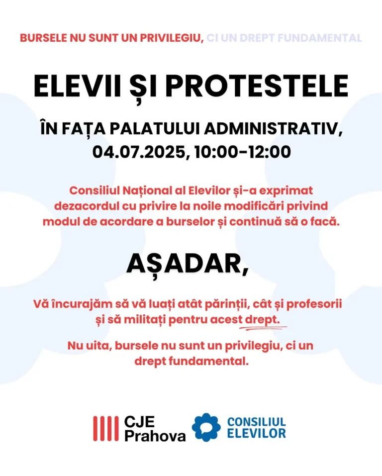 CJE Prahova vă invită să participați vineri, 4 iulie 2025, de la ora 10 dimineața, la protestul elevilor și studenților, în fața Instituției Prefecturii Județului Prahova.