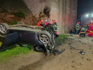 Accident rutier mortal în comuna Berceni. Un autoturism a intrat într-un cap de pod.Două persoane au decedat