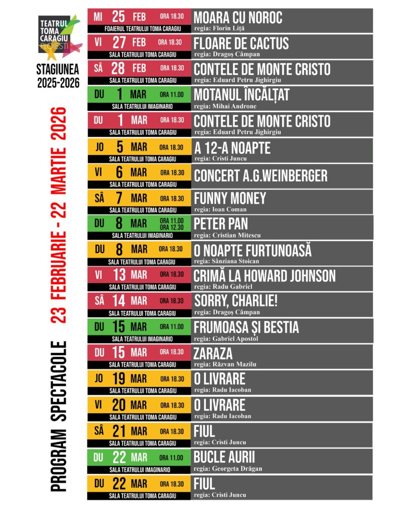 Teatrul ”Toma Caragiu” Ploiești. Program spectacole-23 februarie-22 martie 2026 (foto)