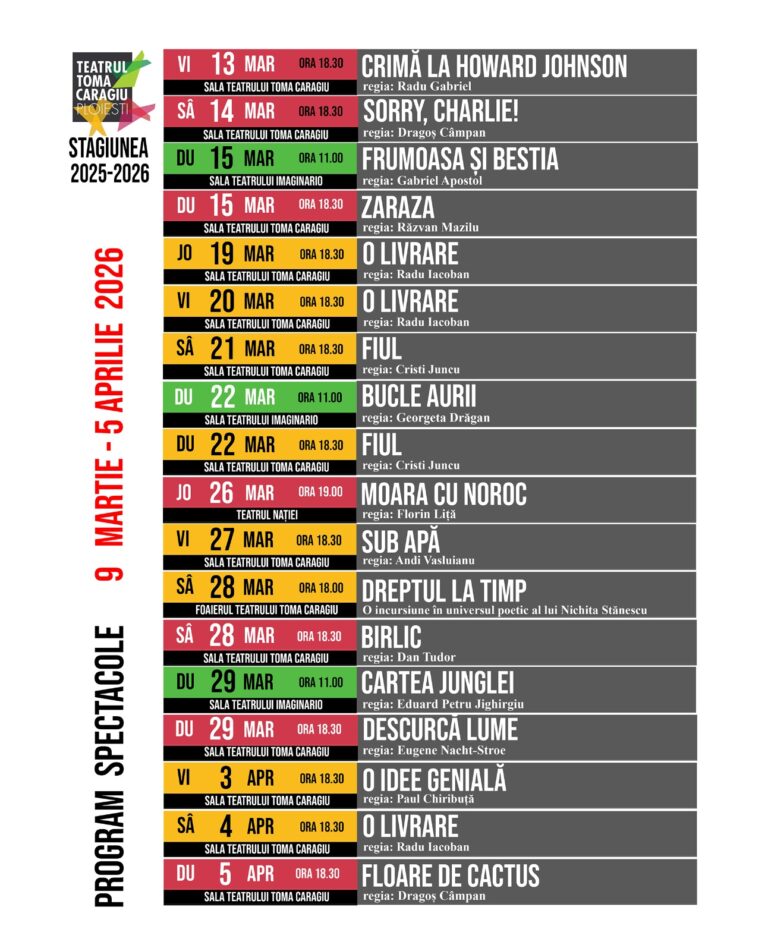 *Acest program poate suferi modificฤri. Pentru informaศii actualizate, vizitaศi site-ulย www.teatruploiesti.ro, secศiunea ๐๐ซ๐จ๐ ๐ซ๐๐ฆ ๐ฌ๐ฉ๐๐๐ญ๐๐๐จ๐ฅ๐.