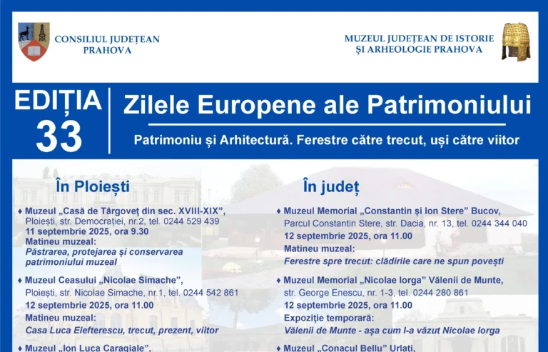 Muzeul Județean de Istorie și Arheologie Prahova și secțiile sale vă invită în perioada 11 – 20 septembrie 2025, să participaţi la evenimentele organizate cu prilejul celei de-a XXXIII-a ediții a Zilelor Europene ale Patrimoniului, cu tema: „Patrimoniu și arhitectură. Ferestre către trecut, uși către viitor”: